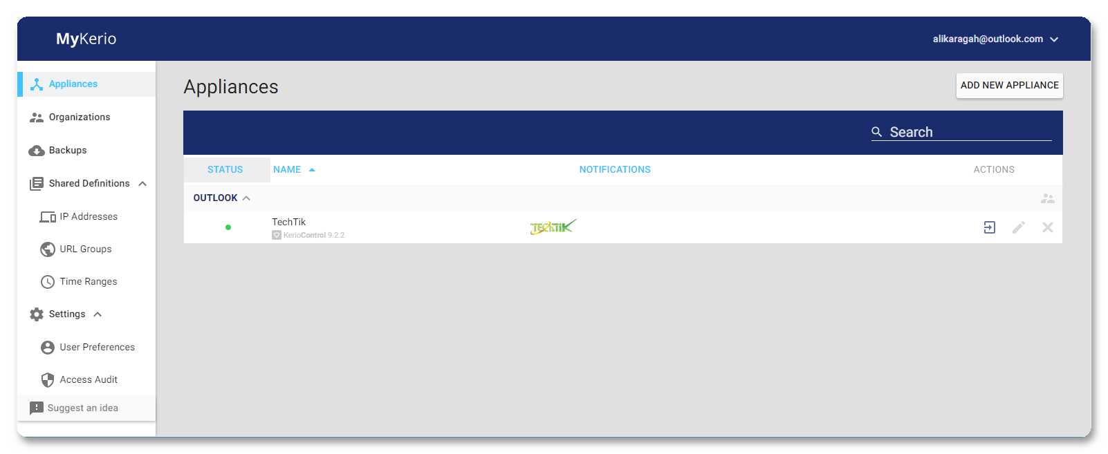 پس از ثبت نام و ورود به صفحه مدیریتی برای اضافه کردن Kerio Control خود بر روی گزینه ADD NEW APPLIANCE کلیک کنید.