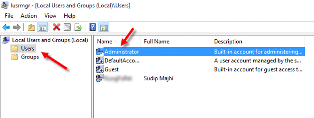 در پنجره باز شده از پنل سمت چپ وارد پوشه Users شوید، سپس بر روی کاربر Administrator دوبار کلیک کنید.
