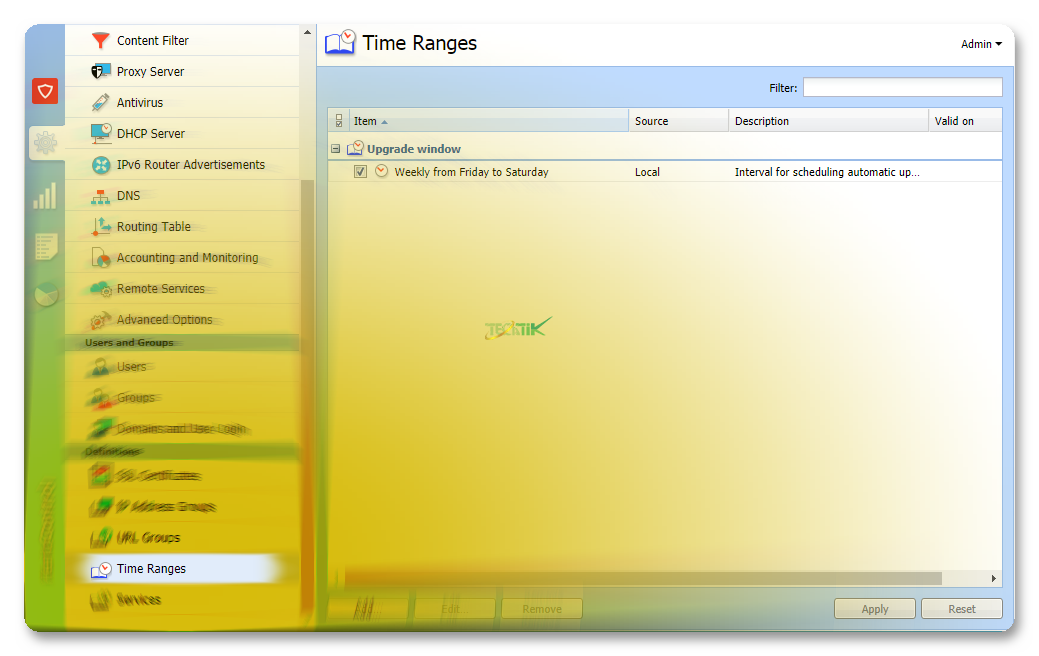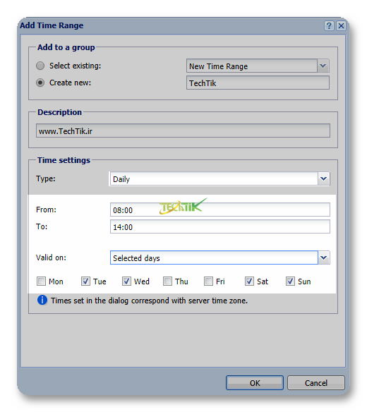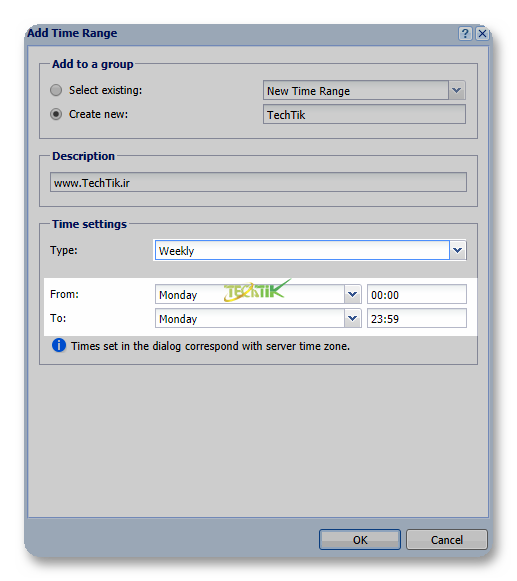 با تعریف یک محدوده زمانی (Time ranges) می توانید به سیاست های مختلفی مانند Traffic rule یا Content Filter و … اعمال کنید. تا این سیاست فقط در این بازه زمانی اعمال باشد.