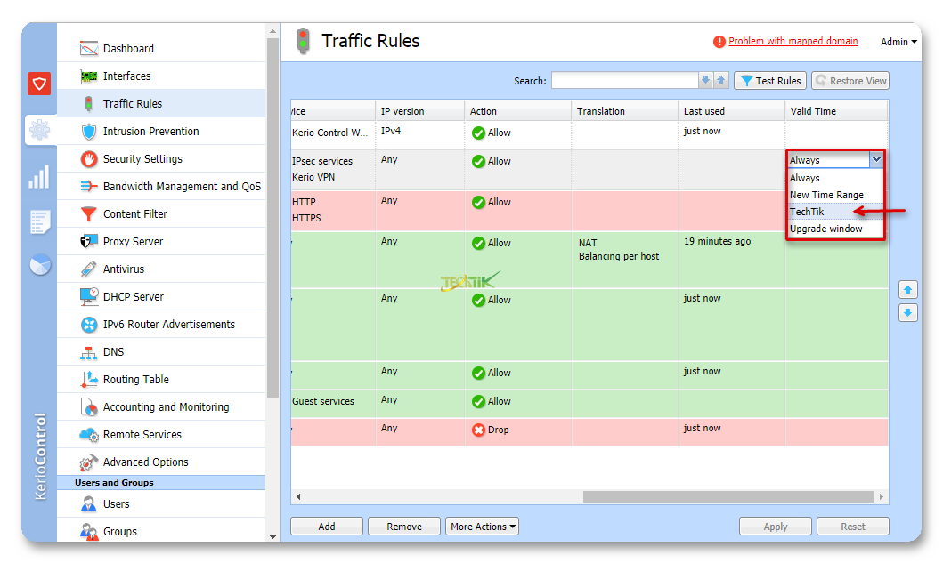 به طور مثال حالا اگر بخواهیم این محدوده زمانی را بر روی یک Traffic Rules اعمال کنید کافیست وارد قسمت Traffic Rules شوید و Rule مورد نظر خود را مشخص کنید سپس از ستون Valid Time می توانید محدوده زمانی خود را انتخاب کنید. تا این فقط در این محدوده زمانی اعمال شود.