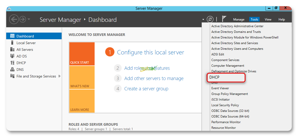 برای باز کردن کنسول DHCP وارد Server Manager شوید، از منو Tools بر روی DHCP کلیک کنید.