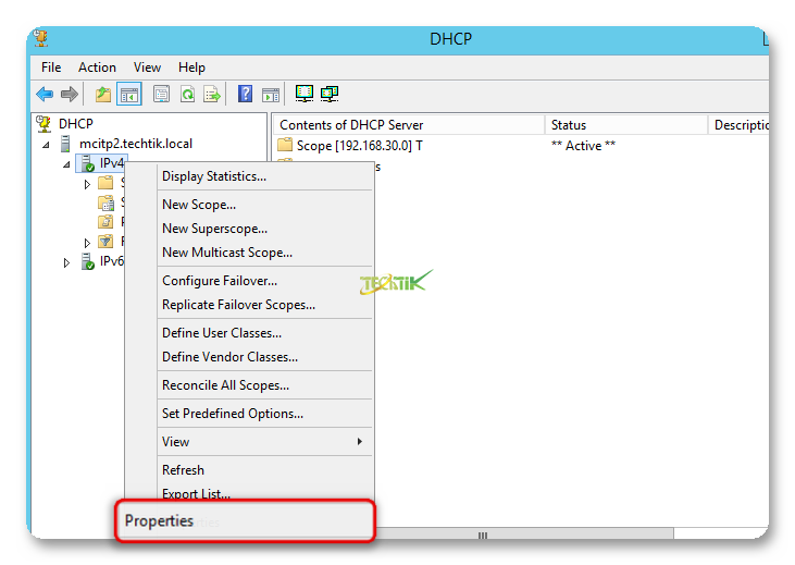 پس از باز کردن کنسول DHCP بر روی IPv4 کلیک راست و گزینه Properties را انتخاب نمایید.