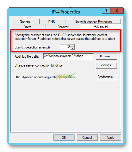 فرض کنید چندین IP Address به صورت Static (دستی) به کلاینت ها اختصاص داده اید و احتمال دارد این مورد در دیتابیس DHCP تعریف نشده است، برای اینکه مشکل Conflict بوجود نیاید در شبکه می توان از قابلیت Conflict detection استفاده کنید.