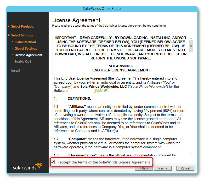 در مرحله License Agreement باید لایسنس برنامه را تایید کنید تا اجازه نصب برنامه را داشته باشید، پس تیک گزینه I accept the terms of the SolarWinds License Agreement را فعال کنید، سپس بر روی گزینه Next کلیک کنید.