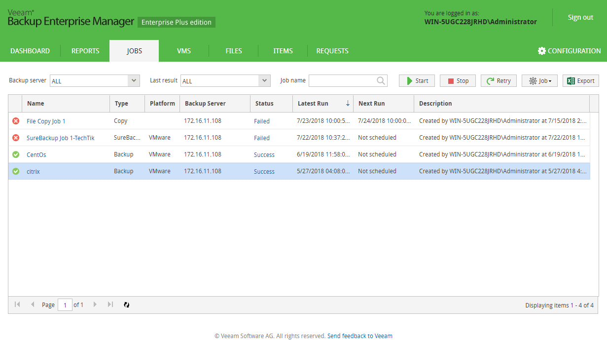 و قابلیت هایی همچون مشاهده وضعیت job ها, Restore ماشین مجازی و فایل ها , تغییر وضعیت Job ها, گزارش گیری ,,,, را در خواهید داشت.