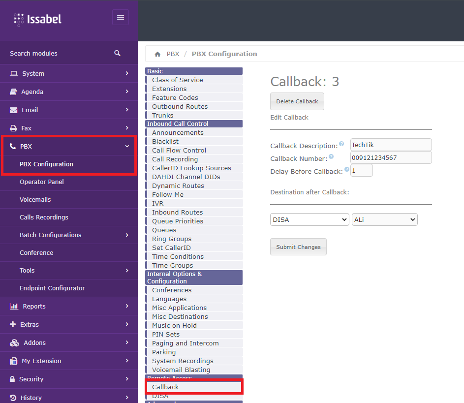 برای فعال سازی CallBack در ایزابل از منو PBX وارد PBX Configuration شوید سپس بر روی CallBack کلیک کنید.